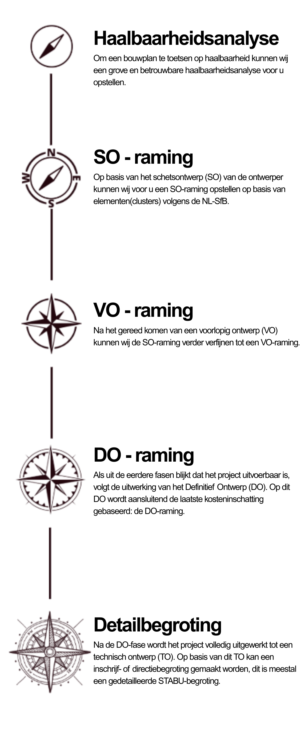 Wie start met een bouwproject, wil graag een overzichtelijk ontwerp- en bouwtraject zonder verrassingen achteraf. Daarom streven wij ernaar om zo vroeg mogelijk in het bouwproces bij het project betrokken te zijn. Op deze manier kan er effectief gestuurd worden op bouwtechnieken, materialisatie en de bijbehorende bouwkosten. Onze voorkeur hierbij is een werkwijze van grof naar fijn, gebaseerd op de NL-SfB structuur en de richtlijnen van de NEN 2699.